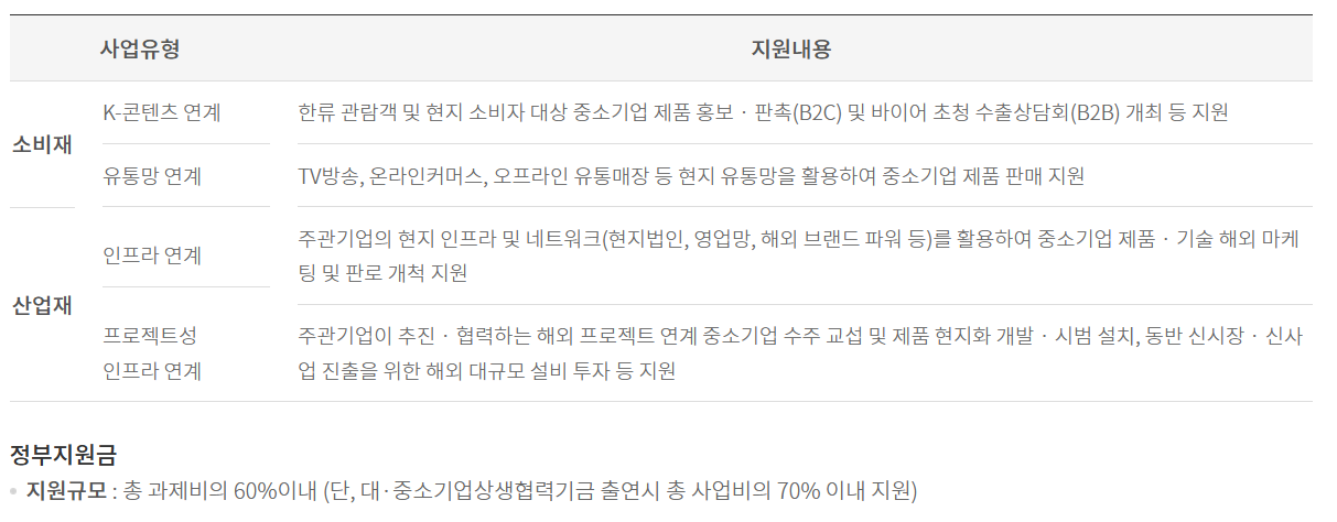 *해외진출 역량이 부족한 중소기업을 위해 대기업의 해외 네트워크(인력, 브랜드 인지도, 해외마케팅등)및 인프라(해외법인, 사무소, 온오프라인 유통매장)를 활용한 공동 마케팅 및 해외판로 개척지원