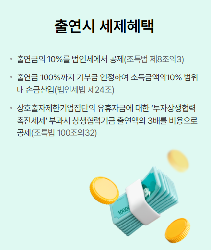 출연한 기업은 출연금의 10%를 법인세에서 공제, 출연금 100%까지 기부금으로 인정하여 소득금액의 10% 범위 내 손금산입등 세제혜택을 받을 수 있습니다.