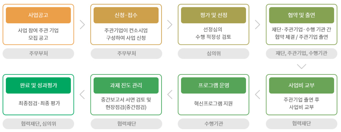 *운영 절차 : 출연신청-기금 출연-지원사업 기획 및 과제 신청-지원사업 심사-지원사업 수행-지우너사업 수행결과에 따른 기금 지급(대중소기업상생 협력기금종합관리 시스템)