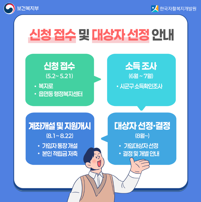 * 복지로(www.bokjiro.go.kr), 자산형성포털(hope.welfareinfo.or.kr)을 통해 필수제출서류 확인 및 양식 작성 필요 대상자 선정 결과는 가입기준 부합 여부를 소득·재산 조사 등을 통해 검토하여 8월 중에 개별 문자메시지로 안내되며, 자산형성포털(hope.welfareinfo.or.kr)에서도 확인이 가능