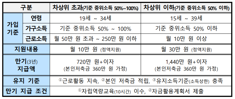 *기초생활수급자 및 차상위계층 청년(기준 중위소득 50% 이하)은 지원을 더욱 두텁게 하여 정부가 월 30만 원을 지원한다. 3년 후 만기 시, 총 1,440만 원(본인저축금 360만 원 가정)과 적금 이자(최대 연 5% 금리)를 수령하게 된다.