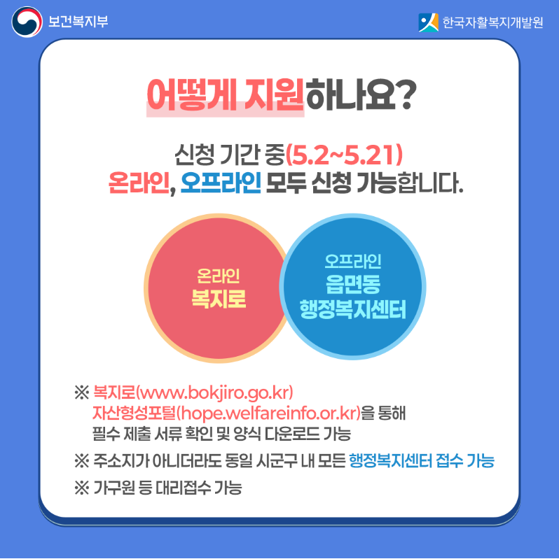 *신규 가입을 희망하는 청년은 신청 기간(5.2~5.21) 중 보건복지부가 운영하는 온라인 복지로 포털(www.bokjiro.go.kr)에 신청할 수 있으며, 본인 주소지 시군구 내 읍면동 행정복지센터에도 방문하여 신청가능.