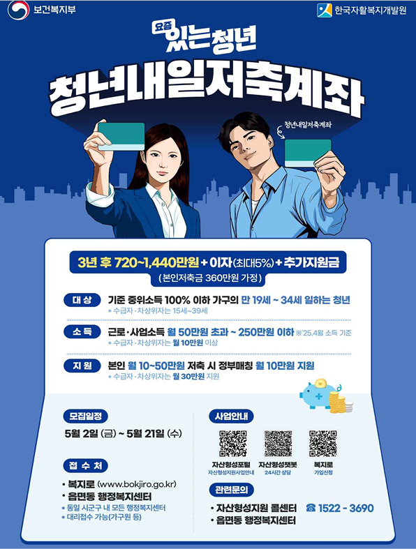 청년내일 저축계좌에 관하여 궁금한 사항은 한국자활복지개발원 자산형성포털 챗봇서비스(hope.welfareinfo.or.kr), 자산형성지원콜센터 (1522-3690) 및 읍면동 행정복지센터에서 상담·안내 가능