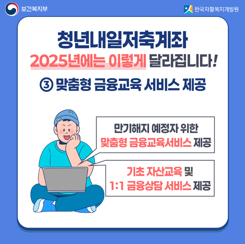청년내일 저축계좌를 통해 지급되는 만기 지원금을 안정적으로 운용·관리하여 탄탄한 자산기반을 형성할 수 있도록 기초 자산교육과 1:1 금융상담 서비스를 지원(금융교육은 전국 광역자활센터에 신청하여 수강가능)