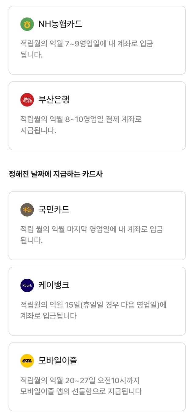 -적립월의 익월 7영업일에 이용중인 카드사로 최증지급금액 입금
